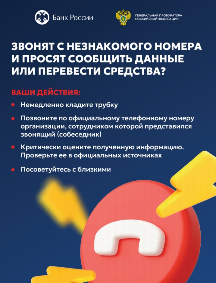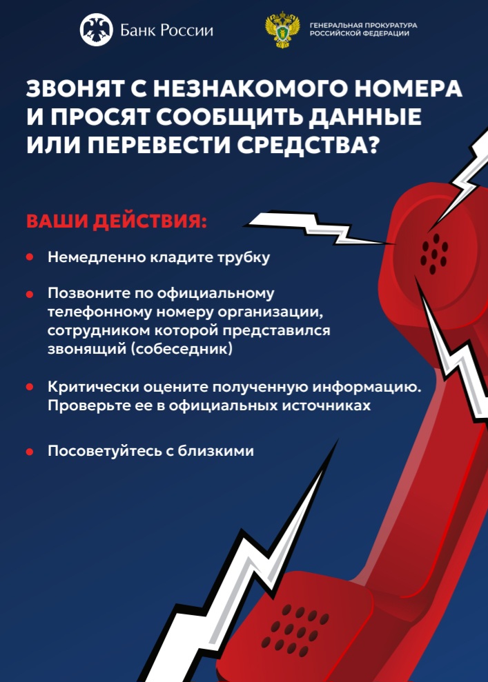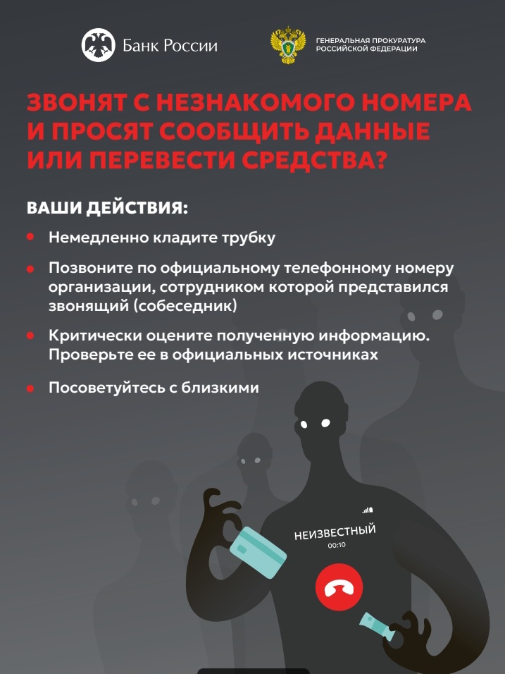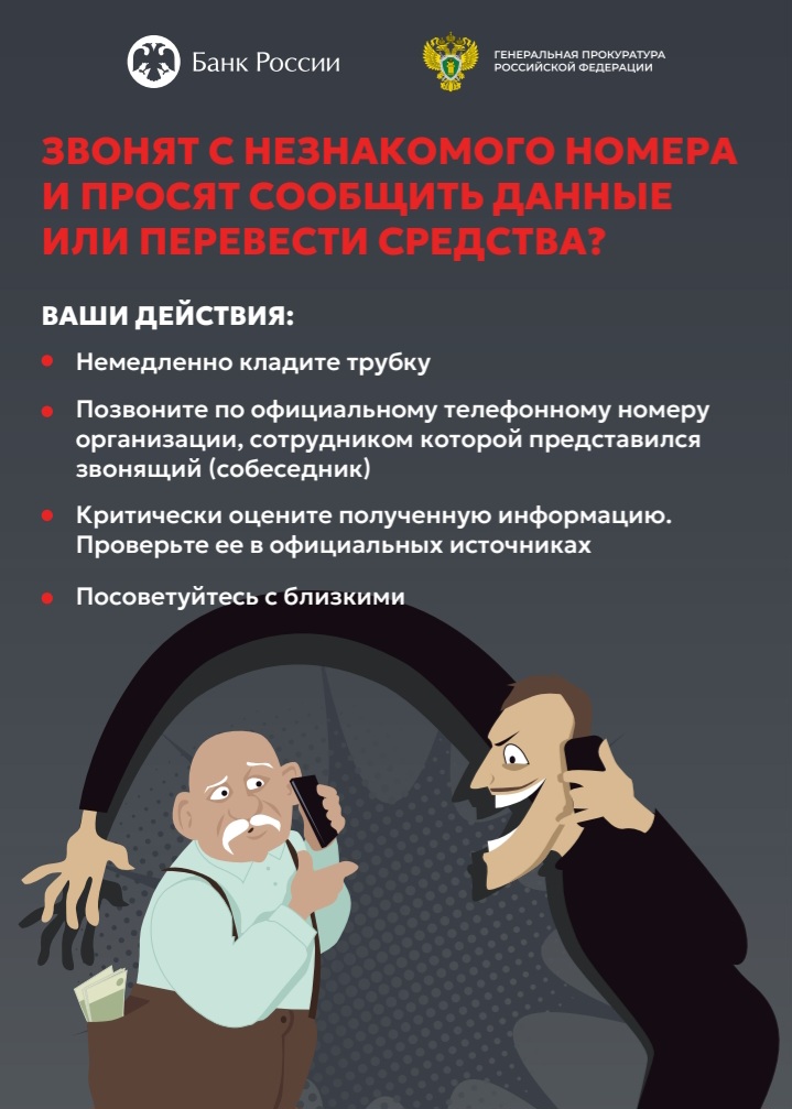 Ввиду возрастания угроз преступных посягательств Генеральной прокуратурой Российской Федерации совместно с Банком России разработаны цифровые плакаты в целях повышения уровня информированности населения о действиях лиц, вводящих в заблуждение в целях хищения денежных средств.
