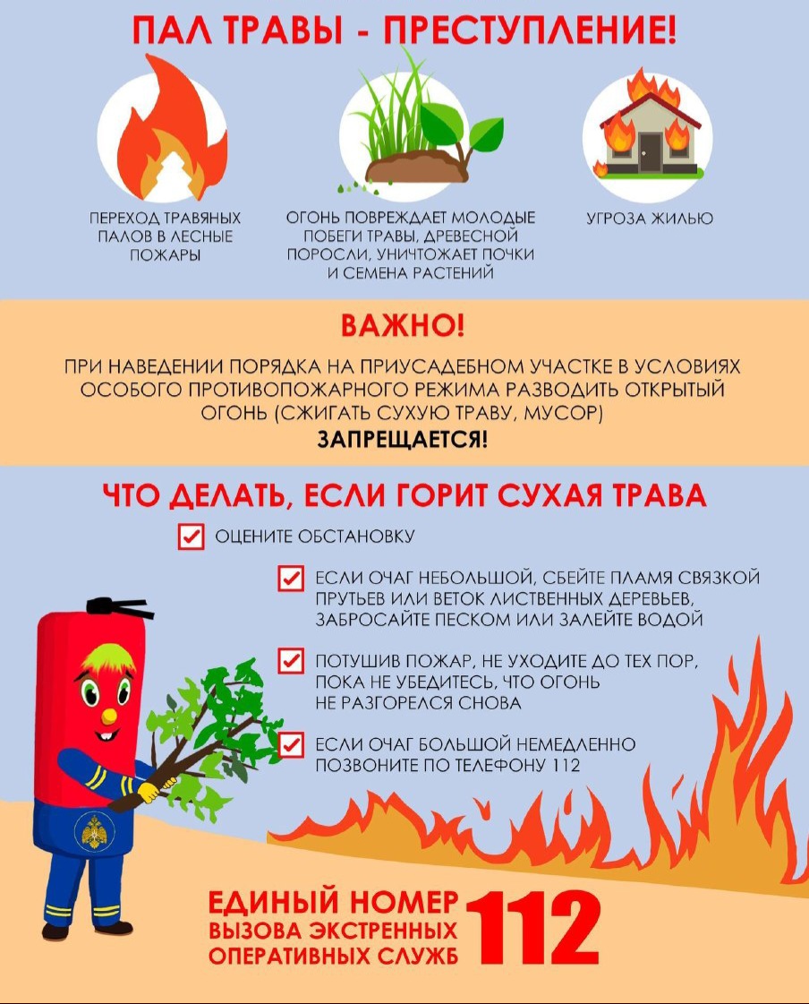 Весенне-летний пожароопасный период характеризуется ростом пожаров, связанных с выжиганием сухой травяной растительности. Вызвать пожар могут брошенный в траву непотушенный окурок, детские игры со спичками или даже намеренный поджог. Как правило, такое горение, в большинстве случаев неконтролируемое, распространяется с большой скоростью и на значительные площади. При сильном ветре фронт огня перемещается со скоростью до 25-30 км/час, что очень затрудняет их тушение. Зачастую такие пожары представляют реальную угрозу жилым строениям и хозяйственным постройкам, а в некоторых случаях и жизням людей. Огонь не прощает легкомыслия и халатности.